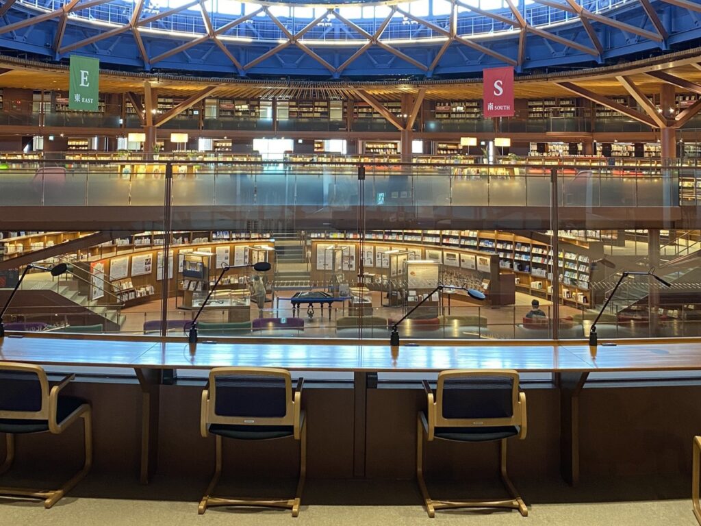 4階にはリングと呼ばれる1周約160メートルの閲覧コーナーがあります。テーマに沿って並んだ書架の間には座って読書ができる席があり、不思議と落ち着ける空間になっています。もし図書館が広すぎてどこを見たら分からない…と思ったら、まず4階に上がってこのリングを1周してみるのはいかがでしょう。上から見渡せば全体像が掴め、行ってみたいコーナーが見つけやすそうです。
