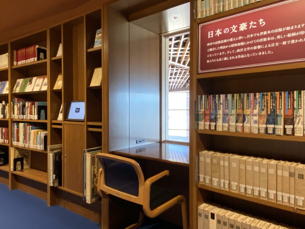 「里の恵み・文化の香り〜石川コレクション〜」のお隣、グレートホール西側にある展示は、「本との出会いの窓」。小さな窓をのぞき込んだら、いつもは選ばないような本が目に留まるかも。